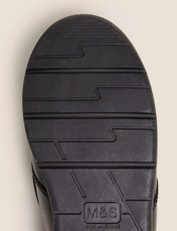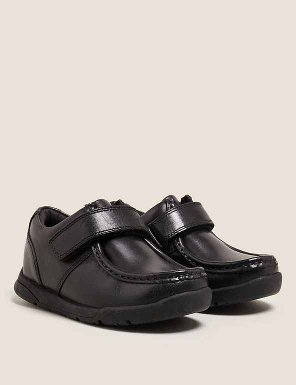 Get them looking smart for school in these traditional leather shoes. Riptape fastening for easy dressing, with a scuff-resistant finish and non-marking soles to protect your floors. Squidgy underfoot foam and a soft collar padding provide day-long comfort. Featuring our Freshfeet™ antibacterial technology to keep things smelling and feeling fresh. Made with a recycled polyester lining and sustainably sourced leather.