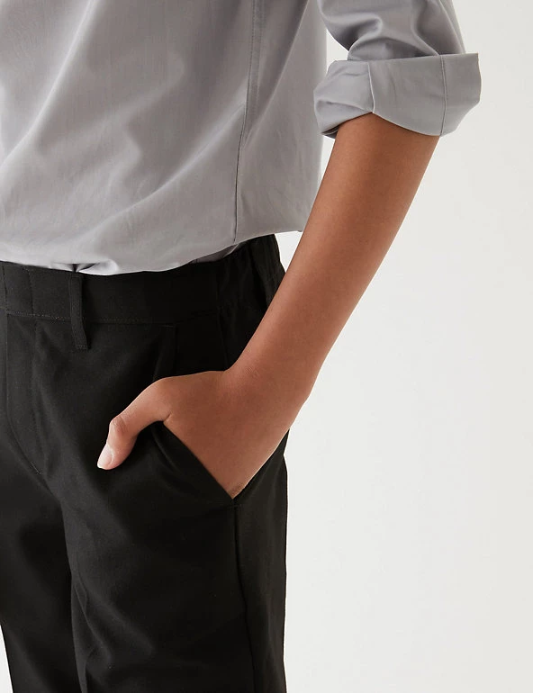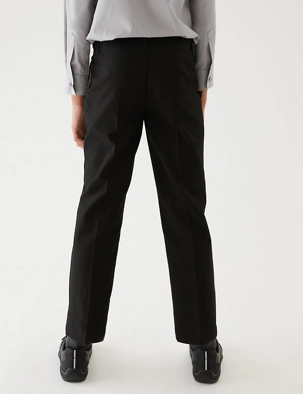 This two-pack of boys’ trousers will keep them feeling smart and comfortable in and out of the classroom. Regular fit with a straight cut leg for a classic, sharp look. As part of our Adaptive range, they have a pull-on waistband to make dressing a little easier. Crease-resistant fabric is also stain and weatherproof, so they keep their looks whatever the day brings. Grow-proof hems and an adjustable waist mean they’ll fit well through growth spurts. Made with recycled polyester and sustainable viscose.