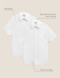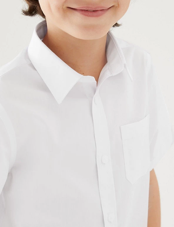 With more cotton than ever, our regular fit short sleeve school shirt comes in a handy two pack. Our ultimate school shirt is Non Iron and Stain Resistant, perfect for the day to day wear and tear of the school classroom. For those younger sizes (up to 8 years) these shirts feature our practical Easy Close top button – rip tape behind the top button making dressing simple. We are transitioning the polyester in this garment to recycled polyester. While we transition, customers may receive items made with either sustainable sourced cotton and recycled polyester or just sustainable sourced cotton and polyester.