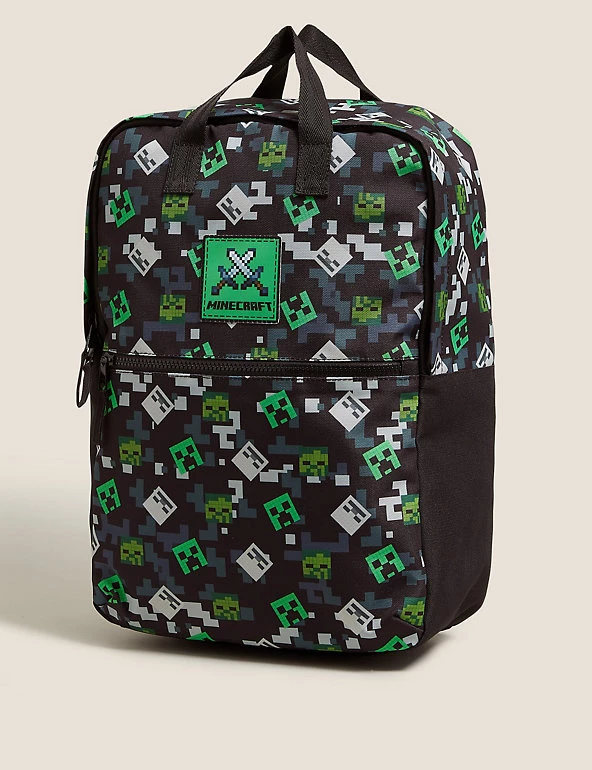 Add an extra dose of fun to their school day with this water repellent zip-up Minecraft™ backpack. Made with wide padded straps that are curved for a comfy fit against the body. This roomy backpack is big enough to fit A4 folders and features a side pocket for a water bottle, as well as a front zipped pocket and interior compartments for stationery. Extra padding in the back enhances comfort, while two top handles offer another way to carry it. Name and class label on the inside. Machine washable for easy cleaning.