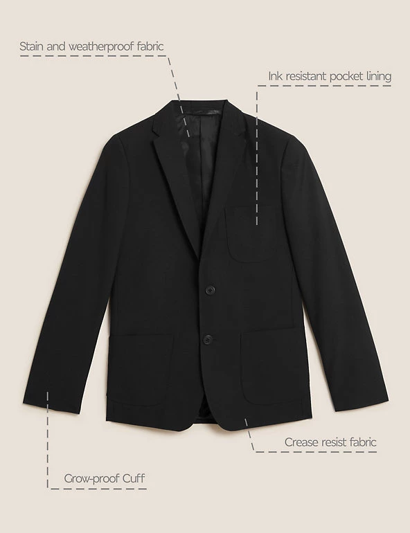 Our classic school blazer comes with Crease Resistant technology to keep it smart all day long. Stain & Weatherproof finish repels water and stain and our special ink resistant chest pocket means leaky pens no longer pose a risk to shirts. And as kids are always growing, our clever blazer comes with adjustable cuffs to allow extra sleeve length, meaning they’ll get a much longer wear. Just unpick and press for an extra 3cm so they last all year. Made with recycled polyester and sustainable viscose.