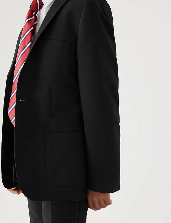 Our classic blazer has a stain and weatherproof finish, so it repels water and dirt and holds onto its smart looks for longer. Slim fit, for a modern outline. Ink resistant pockets help protect shirts from leaky pens. Crease resistant fabric stays neat and crisp throughout the day. Grow-proof cuffs can be unpicked and pressed for an extra 3cm sleeve length. Made with recycled polyester and sustainable viscose.