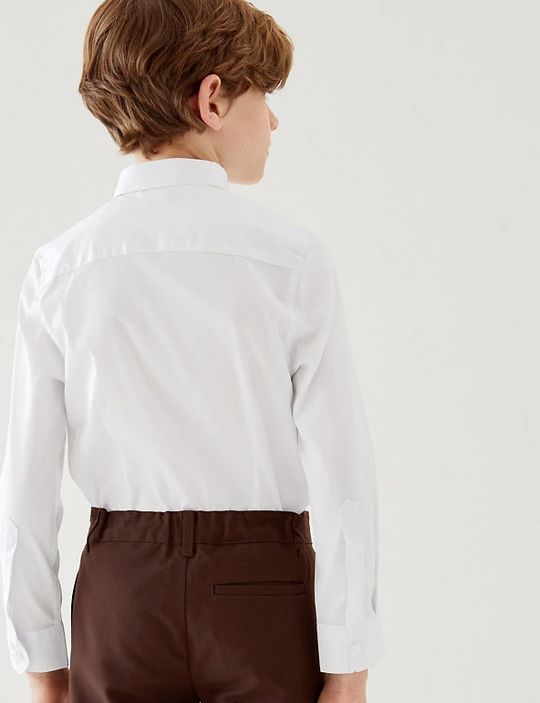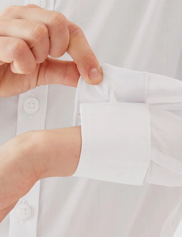 There’s room for a bit of style even in the classroom with these skinny fit school shirts. In a handy two pack, these long sleeve shirts have added stretch for extra comfort and are designed to hug the arms and body a little more for a super on-trend look. Easy to Iron technology means a quick press and away you go. For those younger sizes (up to 8 years) these shirts feature our practical Expandicuff™ cuffs and Easy Close top button. We are transitioning the polyester in this garment to recycled polyester. While we transition, customers may receive items made with either sustainable sourced cotton and recycled polyester or just sustainable sourced cotton and polyester.