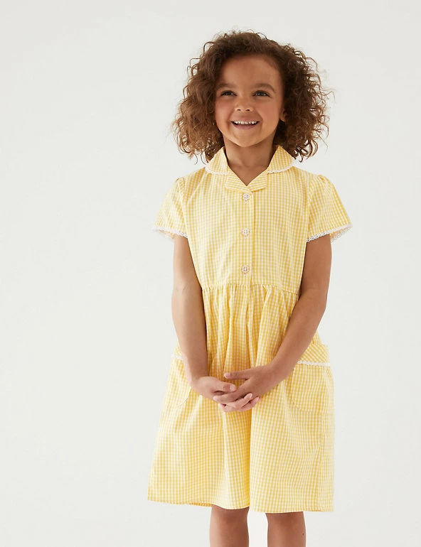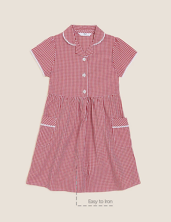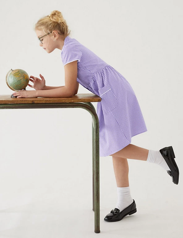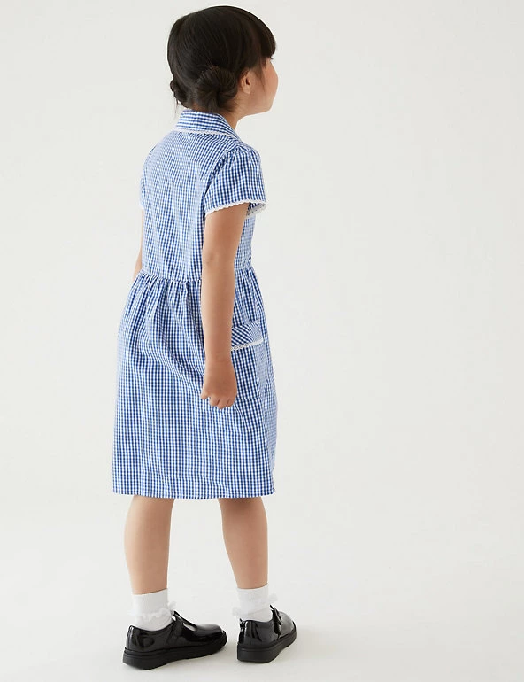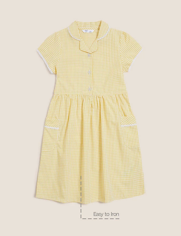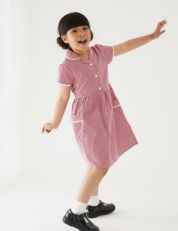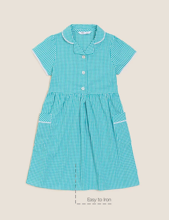 Our gingham school dress has been designed with comfort and style in mind. A timeless regular fit with three-button fastening at the front. Short sleeves with two handy pockets. Our easy-to-iron finish means it just needs a quick press and it’s good to go. We only ever use responsibly sourced cotton for our clothes.