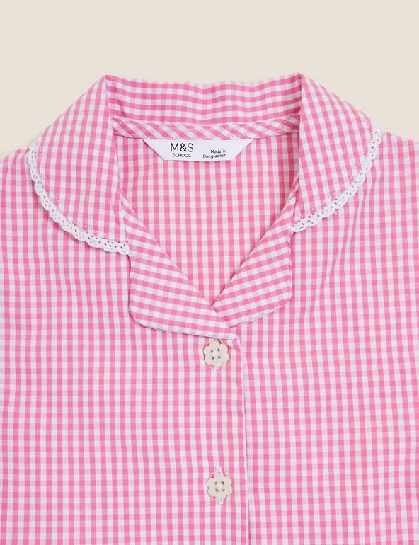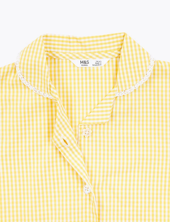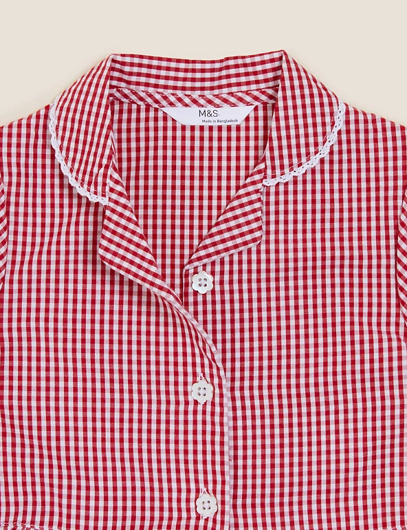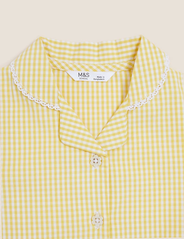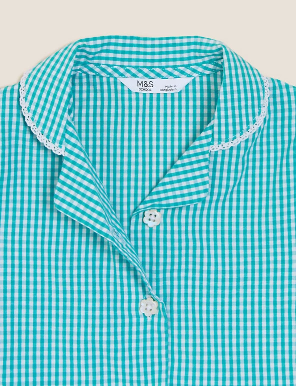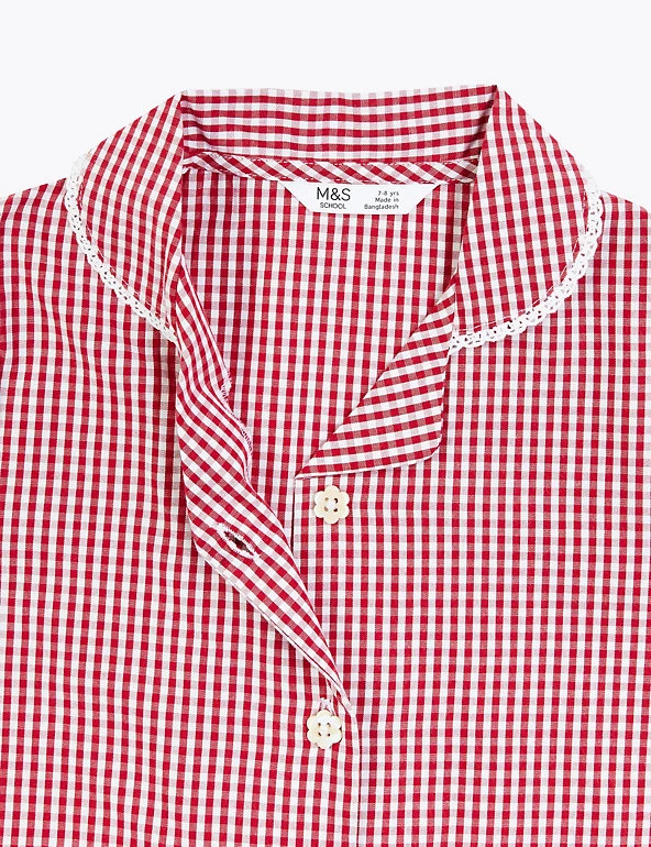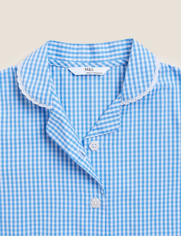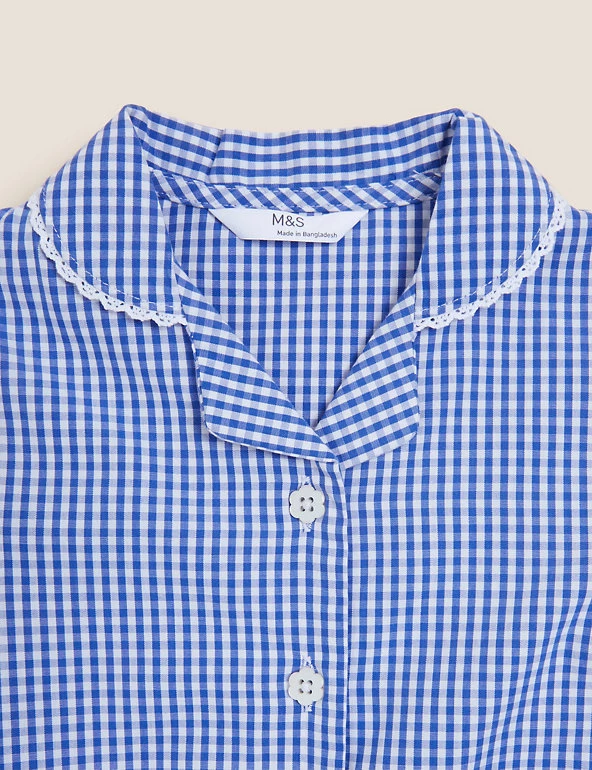 Our gingham school dress has been designed with comfort and style in mind. A timeless regular fit with three-button fastening at the front. Short sleeves with two handy pockets. Our easy-to-iron finish means it just needs a quick press and it’s good to go. We only ever use responsibly sourced cotton for our clothes.