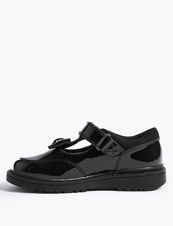 Opt for long-lasting children’s footwear with a sleek style that they’re sure to love with these kids’ school shoes. A simple T-bar fastening makes it easy for active kids to slip these on and off as they’re dashing in and out of the house, while a shiny finish and a bow detail add a nice touch to these children’s school shoes. These school shoes are fitted with our antibacterial technology to ward off odours and a scuff resistant finish for durability along with non marking slip resistant soles.