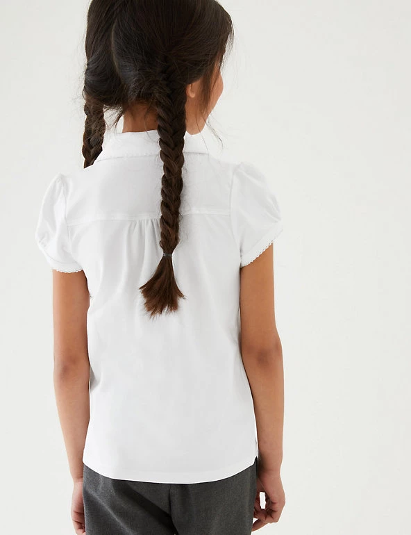 Our cotton rich polo shirts are beautifully soft and have added stretch for extra comfort. Coming in a handy pack of two, you’ll always have smart school uniform to wear. They have a three button placket and additional details like charming picot edging and gathering at the chest for a pretty finish. We are transitioning this garment to organic cotton. While we transition, customers may receive items made with either sustainably sourced cotton or sustainably sourced organic cotton. We only ever use responsibly sourced cotton for our clothes.