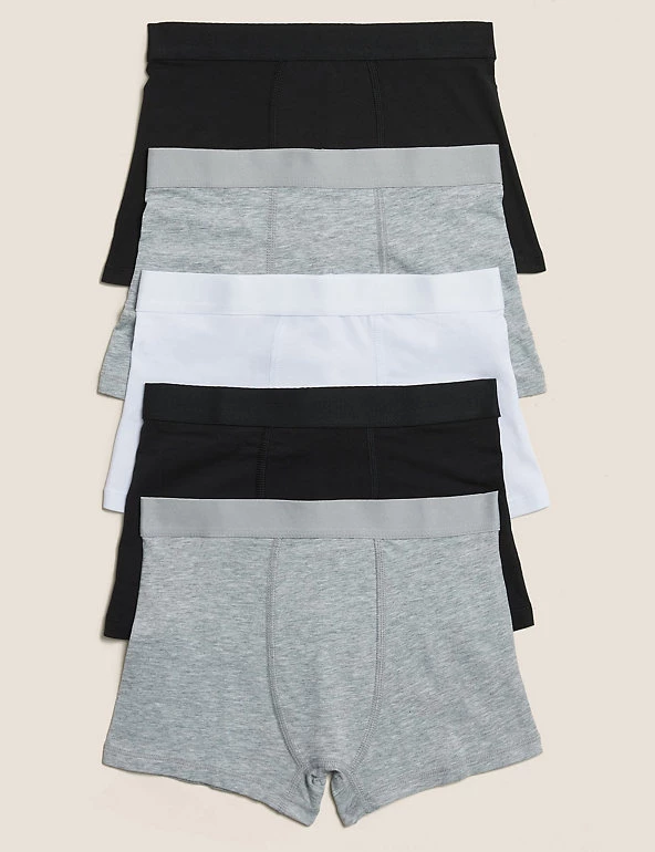 This five pack of essential trunks will keep them comfy all through the week. Elasticated waist for a flexible fit. Made from soft and breathable cotton with added stretch for easy movement.We only ever use responsibly sourced cotton for our clothes.