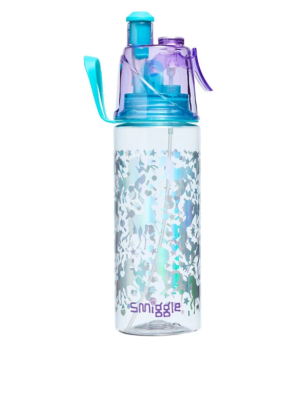 Keep kids hydrated all day with this Smiggle water bottle. It’s designed with a secure screw lid and a hands-free pop-up spout. The water mist trigger is perfect for sports, and there’s a handy carry loop for on-the-go use. Kids will love the shiny unicorn design on the bottle. This item is BPA-free.